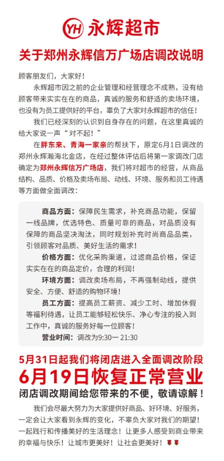 5月27日,永辉超市初度发布门店调改公告。公告炫耀,第一家调改的门店为永辉超市郑州信万广场店,运转调改时辰为5月31日,展望于6月19日复原往日买卖。