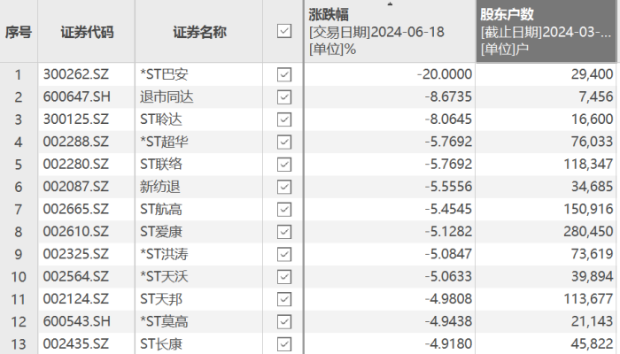 6月18日,在部分风险警示股大涨的同期,逾60只风险警示股股价下落,不少ST股纷纷跌停。