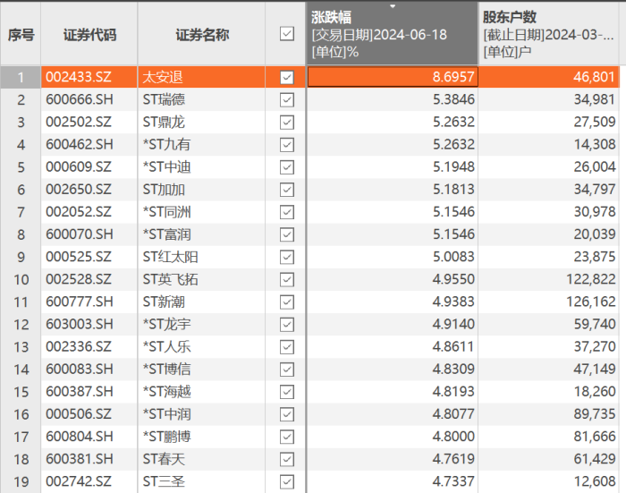 除太安退以外,ST瑞德(600666.SH)、ST鼎龙(维权)(002502.SZ)、*ST九囿(600462.SH)、*ST中迪(000609.SZ)*ST富润(维权)(600070.SH)、*ST同洲(维权)(002052.SZ)、ST红太阳(000525.SZ)等数只风险警示股票涨停。