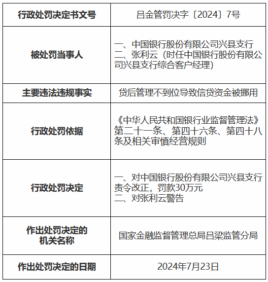 7月31日金融一线音尘,国度金融监督处理总局吕梁监管分局行政处罚信息公开表线路,中国银行股份有限公司兴县支行因贷后处理不到位导致信贷资金被挪用,被责令改正并罚金30万元。时任中国银行股份有限公司兴县支行抽象客户司理张利云受到警告。