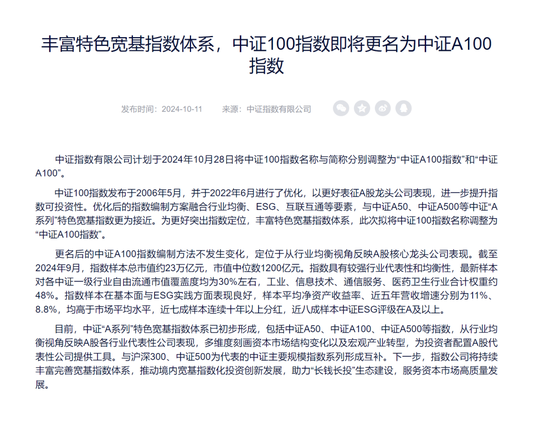 【导读】中证100指数改名为中证A100指数,中证“A系列”指数扩容
