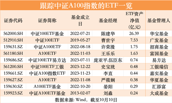Wind数据线路,放浪10月11日,当今全市集追踪中证A100指数的ETF共有10只,易方达、中原等多家基金巨头都有布局,臆测边界接近40亿元。其中,华宝中证100ETF边界为26.39亿元,是当今追踪中证A100指数中边界最大的ETF,单只居品占一王人中证A100ETF边界比重高达66.19%。