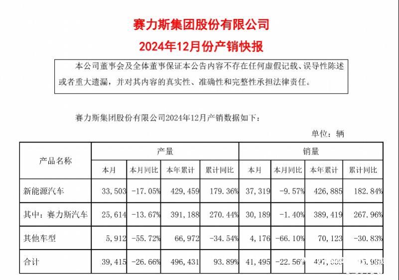 销量方面,12月,赛力斯新动力汽车销量为37319辆,同比下滑9.57%,全年累计销量426885辆,同比增长182.84%。其中赛力斯汽车12月销量为30189辆,同比下滑1.4%,全年累计销量389419辆,同比增长267.96%。
